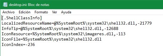 Bien que ce fichier ne soit pas protégé et puisse être supprimé, cela peut nous faire perdre la configuration du dossier en question et, en outre, avoir des problèmes lors de l’ouverture de l’ Explorateur Windows ou de la génération de vignettes des dossiers. De plus, Windows lui-même régénérera automatiquement ce fichier sur votre ordinateur, de sorte qu’il réapparaîtra automatiquement. Ce fichier peut être facilement ouvert avec un éditeur de texte, tel que le Bloc-notes, et a une apparence simple comme celle-ci.