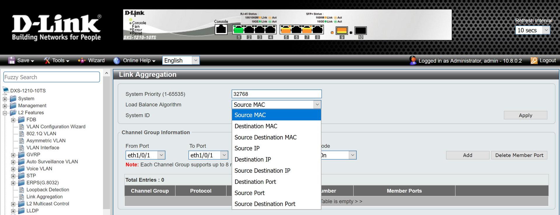 Un autre aspect négatif est que, selon l’équilibrage de charge que nous avons dans le firmware du routeur , LACP ne pourrait pas nous fournir la vitesse de 2 Gbps. LACP prend en charge différents algorithmes d’équilibrage de charge afin que les deux liens physiques transfèrent le trafic, le plus courant étant src-mac, bien que nous puissions également trouver src-dst-mac ou src-dst-ip qui ont une plus grande granularité. Dans l’image suivante, vous pouvez voir quelques algorithmes d’équilibrage de charge d’un commutateur L3 professionnel :