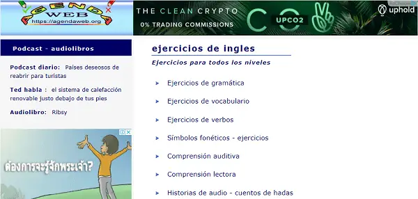 Agenda Web présente une interface très démodée par rapport à d’autres sites, mais vous y trouverez un grand nombre d’exercices pour apprendre l’anglais sur toutes sortes de choses. En conséquence, vous avez la possibilité de le parcourir à la recherche de la leçon que vous souhaitez , soit pour pratiquer des verbes réguliers et irréguliers, des fonctions de grammaire, entre autres.