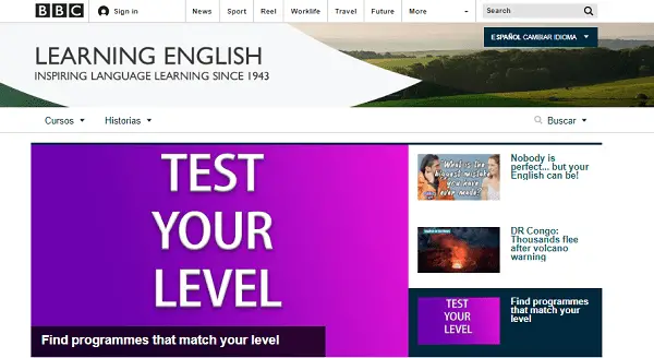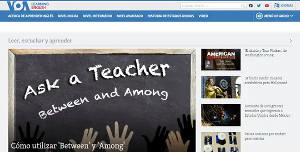 Il s’agit de la page officielle de Voice of America, connue en espagnol sous le nom de Voice of America, qui vous offre une plate-forme totalement gratuite où vous pouvez apprendre et pratiquer l’anglais. Il contient des vidéos et des articles intéressants pour enseigner l’utilisation des verbes, des adjectifs et d’autres types de mots. Il enseigne depuis 1959 via des émissions de radio et aujourd’hui, le site Web propose des options d’apprentissage pour les niveaux débutant, intermédiaire et avancé .