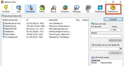 eMule a la possibilité d’ajouter et de mettre à jour des serveurs manuellement ou automatiquement avec le serveur rencontré de l’IRC d’Espagne . Avec l’une des méthodes que vous choisissez, vous pouvez insérer les serveurs rapidement et facilement. Une fois que vous les avez installés, testez les serveurs avec n’importe quel téléchargement.