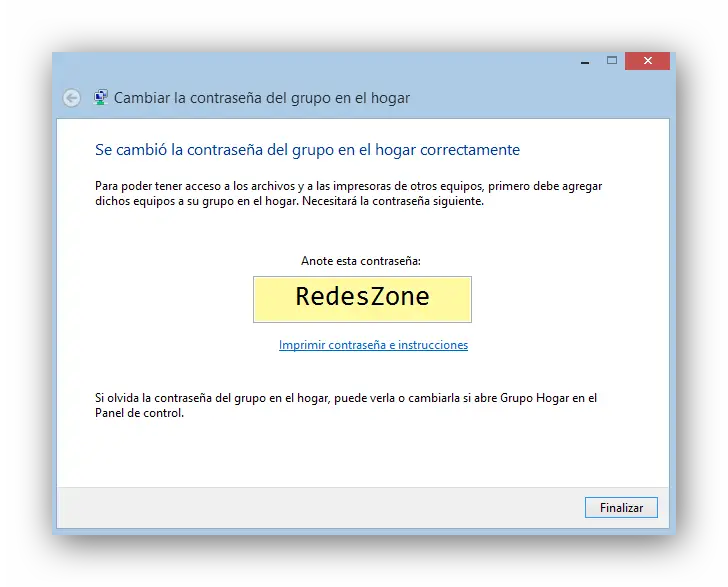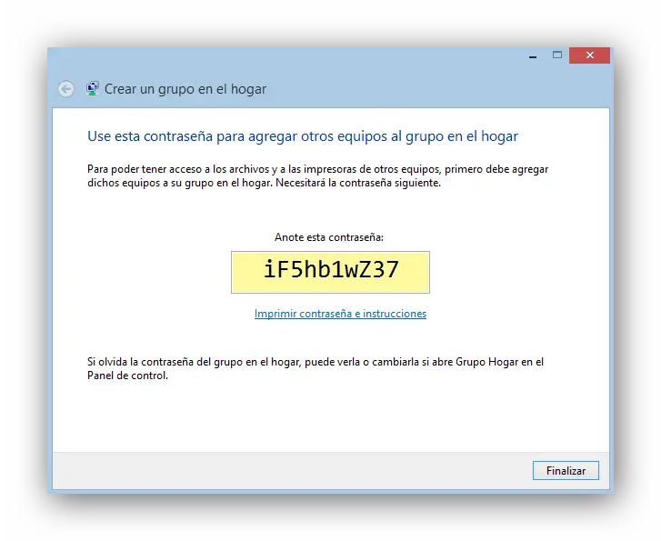 Windows configurera automatiquement les permissions des fichiers et dossiers pour la création du groupe résidentiel et nous montrera un mot de passe. Il faut utiliser ce mot de passe sur l’autre ordinateur pour se connecter au groupe résidentiel déjà créé. Bien qu’il s’agisse d’un mot de passe étrange, nous pouvons le changer plus tard pour un mot de passe plus simple.