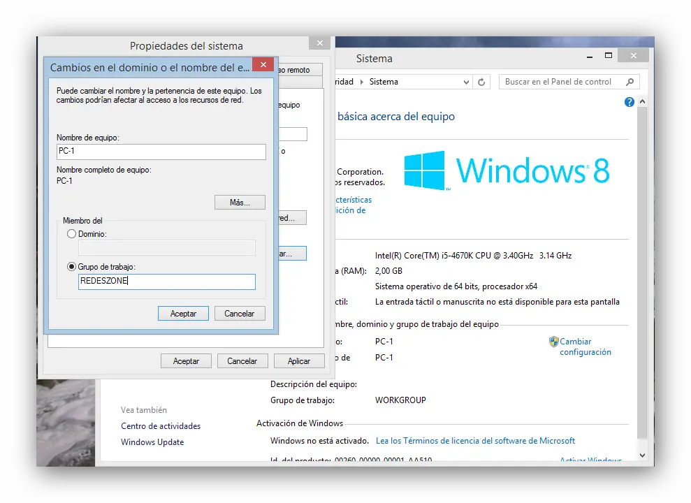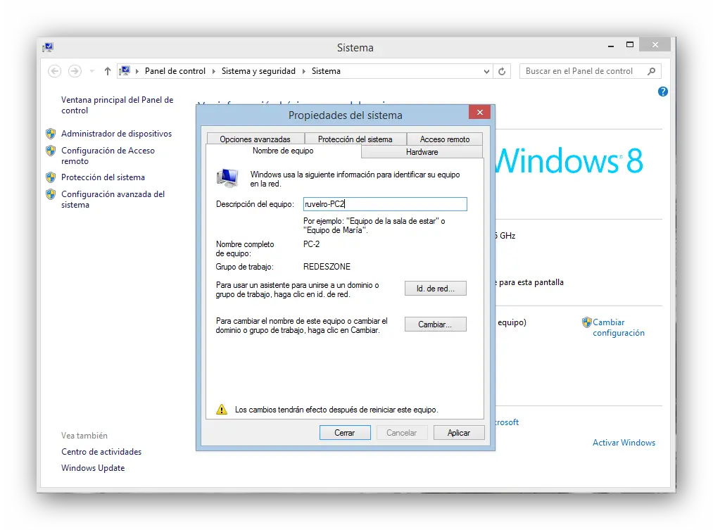 Il faut s’assurer que chaque ordinateur a un nom différent (PC-1, PC-2, etc. dans notre cas) mais qu’ils appartiennent tous au même groupe de travail (REDESZONE dans cet exemple, bien qu’on puisse en mettre n’importe lequel). La description est facultative, mais elle peut nous aider à mieux identifier le matériel.
