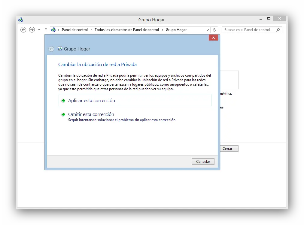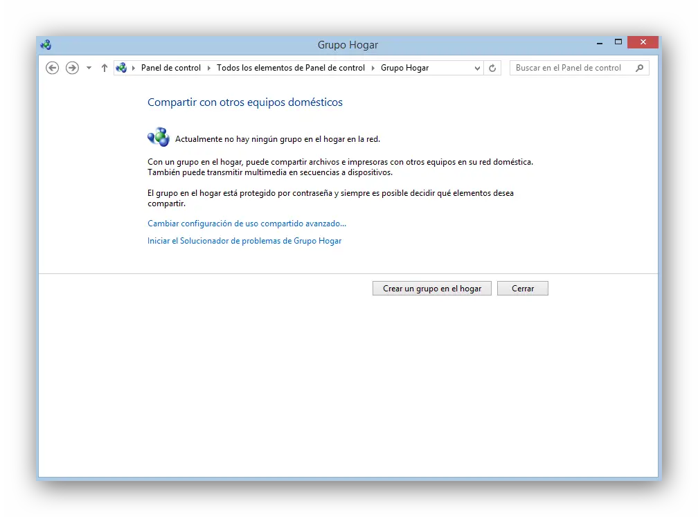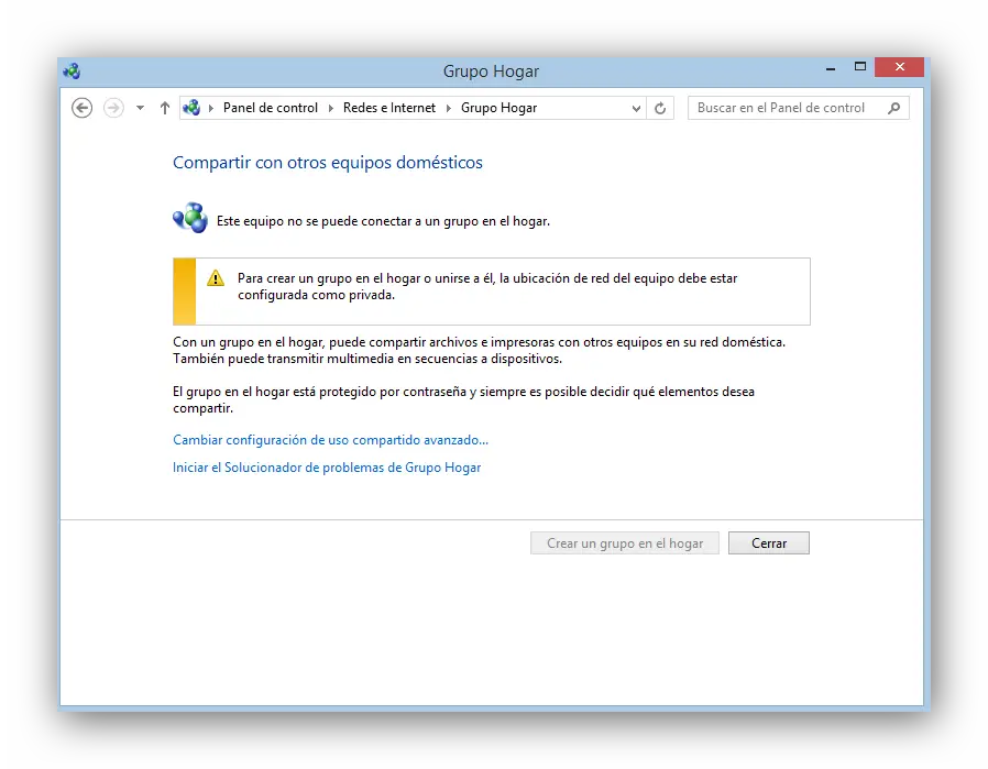En cliquant sur « Groupe d’accueil », nous verrons une nouvelle fenêtre où nous commencerons la création de ce groupe. Afin d’éviter les erreurs lors de la création du groupe de travail, nous devons avoir préalablement configuré la connexion Internet en tant que «Privé» ou «Travail», sinon nous ne pourrons pas créer ce groupe de travail. Si tel est le cas, l’utilitaire de résolution des problèmes de Windows fournira la solution.