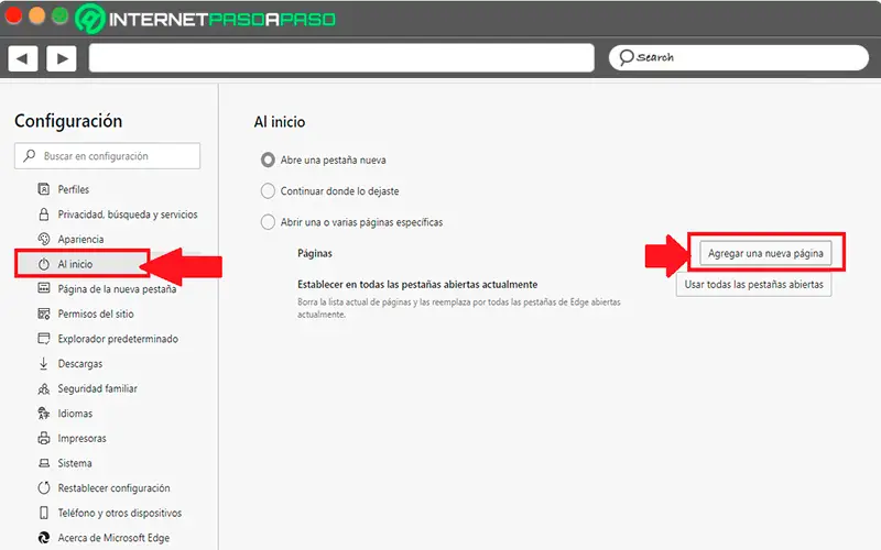 - Dans la fenêtre «Paramètres» , vous devez sélectionner l’option «Au démarrage» située dans le menu à gauche de votre écran. Là, vous devez sélectionner l’option «Ajouter une nouvelle page».