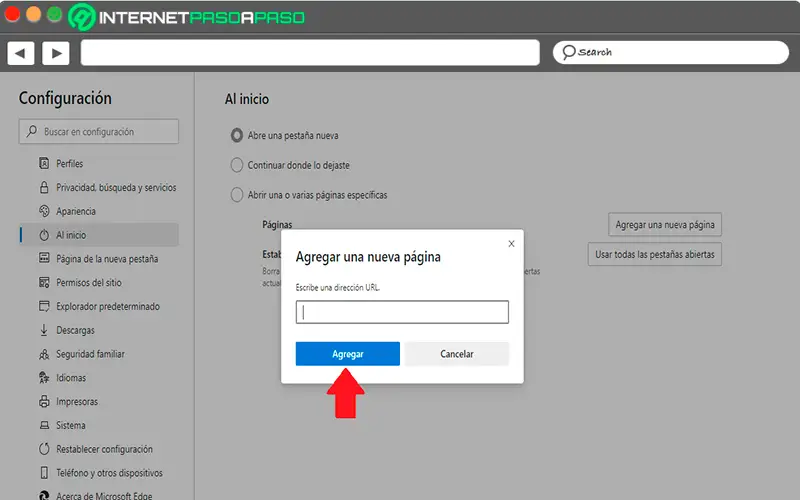 - Une fois cette option sélectionnée, une boîte de dialogue apparaîtra sur l’écran où vous devez écrire l’adresse du site Web que vous souhaitez voir apparaître comme page d’accueil, dans ce cas ce serait «google.com», une fois écrite, il vous suffit de cliquer Cliquez sur le bouton «Ajouter» pour appliquer les modifications.