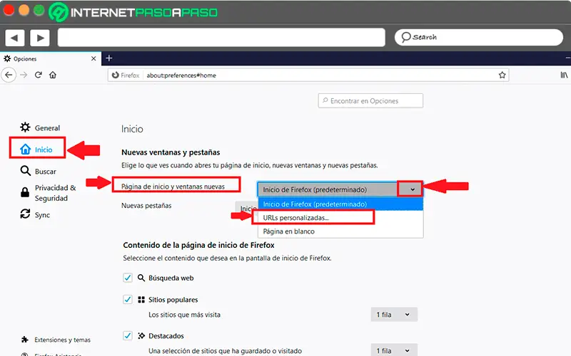 - Dans la section d’accueil, vous verrez l’option «Page d’accueil et nouvelle fenêtre» , vous devez y sélectionner le menu déroulant et cliquer sur les éléments «URL personnalisées».