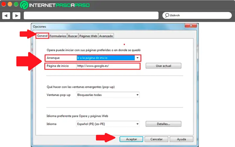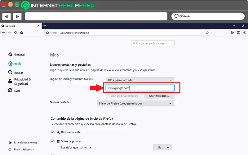 - Une fois que vous êtes dans le menu «Général» , vous devez sélectionner la rubrique «Page d’accueil» et dans l’espace correspondant, vous devez entrer l’adresse Web que vous souhaitez, dans ce cas «google.com».