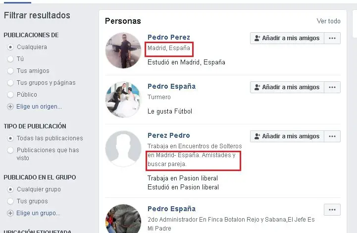 Autrement dit, dans la barre de recherche, vous devez entrer la ville où se trouve cette personne. Par exemple, si vous recherchez Pedro Pérez qui vit à Madrid, dans la barre de recherche, vous devez entrer «Pedro Pérez Madrid Espagne» . De cette façon, vous verrez tous les résultats des personnes portant ce nom qui vivent dans la capitale espagnole.