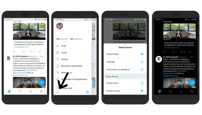 5º- Lorsque vous avez ajusté les paramètres à votre guise, faites glisser le menu vers le bas pour le faire disparaître. Vos modifications sont enregistrées automatiquement. Dans la dernière capture de l’image suivante, vous pouvez voir à quoi ressemble le mode nuit noire sur Twitter pour Android.