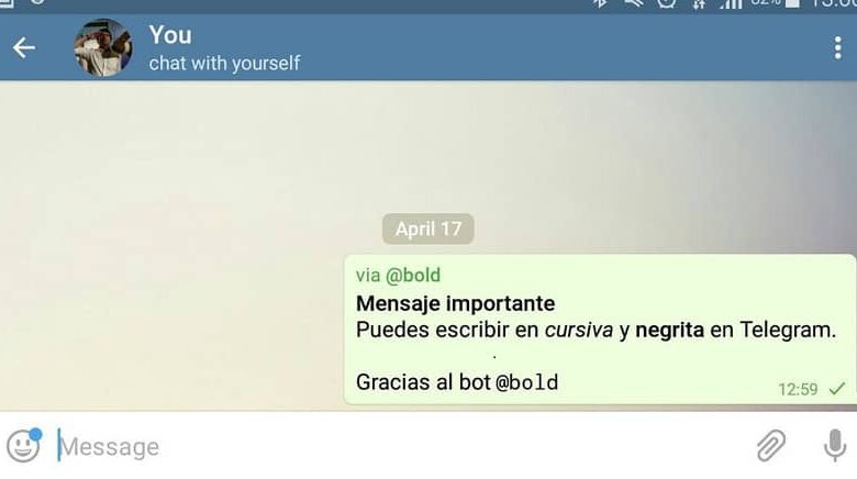 Différents robots ou programmes peuvent être ajoutés à l’ application Telegram pour augmenter ses fonctionnalités; mais cette application a déjà un bot inclus qui vous permet d’écrire en gras, à espacement fixe et en italique. Ce bot est très facile à utiliser, ce que vous devez faire est ce qui suit: