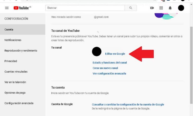 - Le système vous redirigera vers les options de configuration, vous devez localiser l’onglet Votre chaîne YouTube , vous pouvez facilement la trouver car en dessous se trouvent votre photo de profil et votre nom.