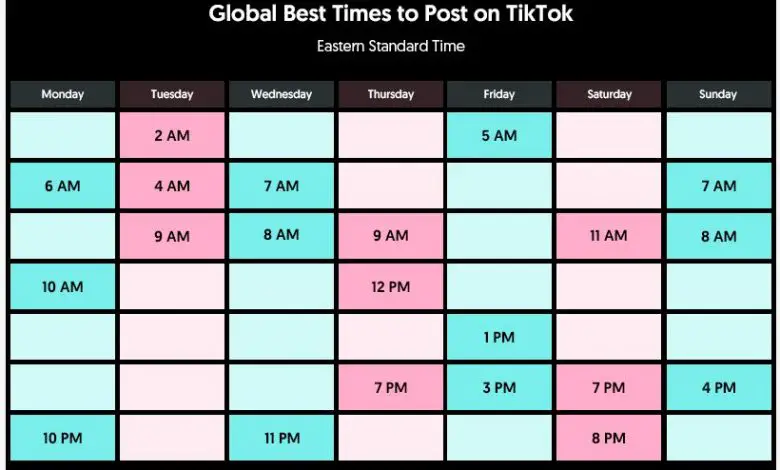 Après avoir analysé plus de 100 000 publications, le site Influencermarketinghub a publié ce tableau avec les meilleurs moments pour publier sur TikTok selon les fuseaux horaires.