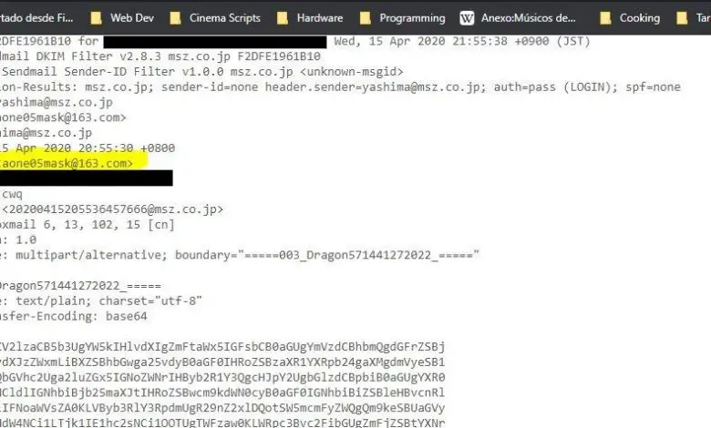 Ci-dessous, vous verrez un texte très détaillé. Bien qu’il suffira d’insister sur certaines sections. Ainsi, vous pouvez facilement vérifier si le message que vous avez reçu a un expéditeur modifié ou non. Tout d’abord, allons au bas de la page et voyons le «De» . N’oubliez pas qu’il s’agit de l’expéditeur du message.