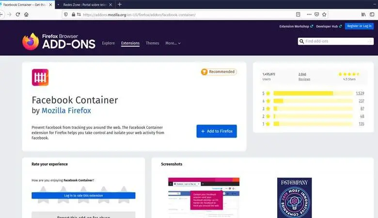 Facebook Container , comme l’extension est officiellement appelée, est entièrement gratuit. Il est préférable de le télécharger depuis la boutique officielle de Firefox. Comme nous le disons toujours, nous vous recommandons d’ajouter ce type de logiciel uniquement à partir de sources officielles. Ce n’est qu’ainsi que nous éviterons d’installer des logiciels modifiés de manière malveillante.