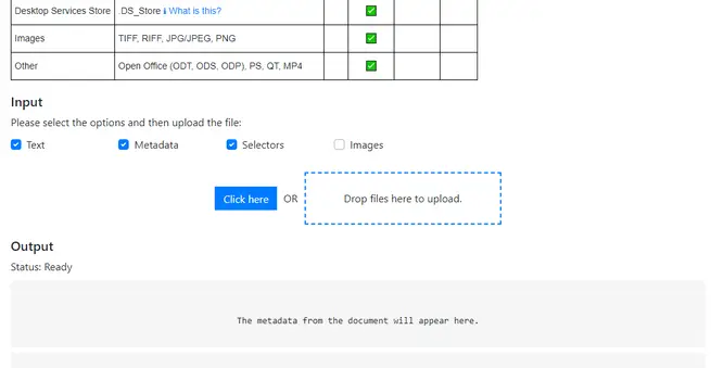 Cet outil vous permet d’extraire du texte, des métadonnées et de sélectionner des images à partir de fichiers pris en charge. Magic File Tool peut fonctionner avec les types de fichiers suivants :