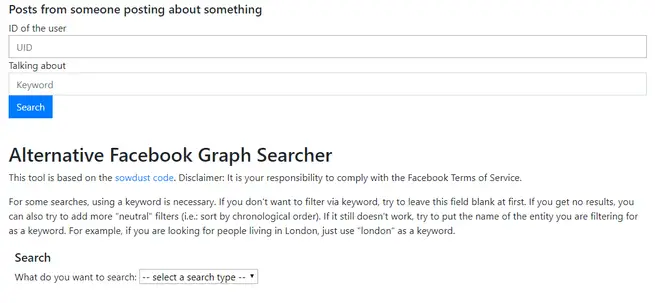 Dans » Facebook Graph Searcher «, nous pouvons rechercher des mots publiés sur le réseau social, un jour spécifique, un mois spécifique ou un intervalle de temps. De plus, nous pouvons également rechercher un mot spécifique pour un utilisateur spécifique. Cet outil peut être utile pour trouver quelque chose de spécifique que nous recherchons auprès d’un utilisateur.
