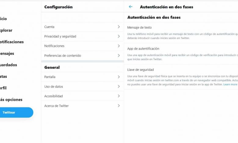 Pour activer l’authentification en deux étapes sur Twitter, vous devez accéder à notre profil, entrer Plus d’options et accéder aux Paramètres et à la confidentialité. Une fois ici, nous donnons le compte, la sécurité et l’authentification en deux phases.