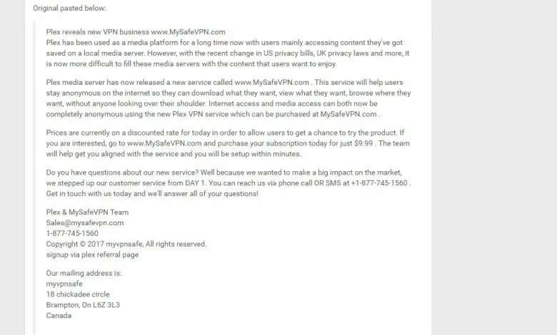 L’équipe Plex et MySafeVPN ont signé l’e-mail. Ce n’était pas une arnaque courante lorsqu’un prince nigérian a tenté de vous envoyer de l’or. Cet e-mail est une chose professionnelle. Il y avait un site Web, une adresse physique appropriée pour l’entreprise et un numéro de téléphone. Vice a fait des recherches pour savoir qui était derrière cet e-mail, mais l’utilisateur moyen n’ira probablement pas aussi loin.