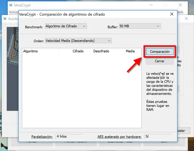 Dans la liste déroulante, nous aurons la possibilité de sélectionner un grand nombre d’algorithmes de cryptage symétrique, par défaut c’est AES, en fait, si notre CPU prend en charge AES-NI (AES par matériel), nous aurons de bonnes performances. Si nous cliquons sur « Comparaison », nous pouvons lancer un « benchmark » pour vérifier lequel de tous est le plus rapide.