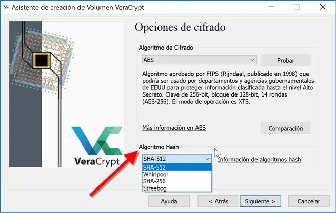 Une fois que nous aurons choisi l’algorithme de chiffrement symétrique (nous avons choisi AES ), nous devrons choisir l’algorithme de hachage. Par défaut c’est SHA512 , l’un des plus sécurisés actuellement, nous avons donc choisi celui-ci.