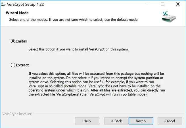 Une fois le programme téléchargé, nous devons l’installer comme n’importe quel autre programme. Nous obtiendrons un assistant d’installation qui nous donnera la possibilité de l’installer sur notre propre ordinateur, ou d’extraire VeraCrypt et de l’utiliser «portable», c’est-à-dire sans l’installer sur l’ordinateur lui-même. Un détail important est que si nous allons chiffrer l’ensemble du système ou la partition où se trouve le système d’exploitation, nous devons l’installer et ne pas l’utiliser en mode «portable».