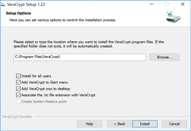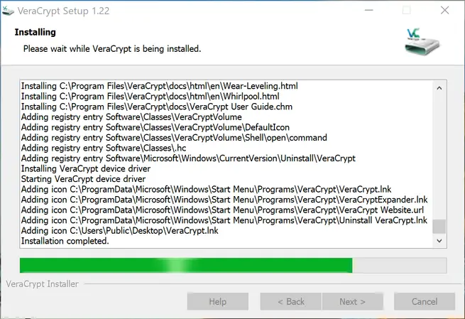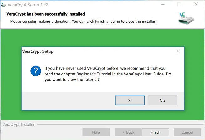 Une fois que nous aurons cliqué sur «Installer», nous obtiendrons les options d’installation typiques pour tous les utilisateurs, en créant un raccourci sur le bureau et également dans le menu Démarrer. Une fois l’installation terminée, il nous conseillera de suivre un petit guide du débutant sur VeraCrypt.