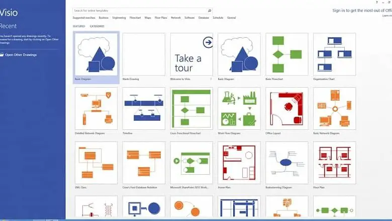 Le moyen le plus simple de commencer consiste à utiliser un modèle d’organigramme intégré et à en tirer parti. Dans Visio 2016, le modèle d’organigramme peut être trouvé en accédant au menu Nouveau.
