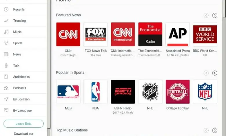 Avec TuneIn, vous serez en mesure d’être au courant de sujets tels que la radio locale , les tendances, la musique, le sport, les nouvelles, les livres audio et le podcast; qui, en fait, font partie des catégories présentes sur ce site.