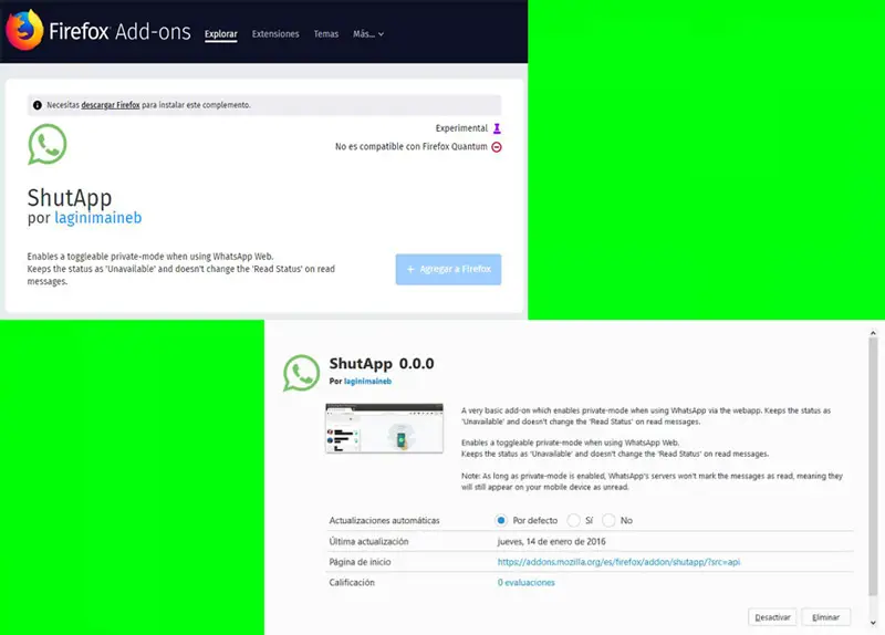 Heureusement, pour ceux qui préfèrent utiliser WhatsApp Web, il existe également une excellente alternative qui leur permet de masquer leur statut «en ligne» même lorsqu’ils utilisent l’application depuis leur PC . Ainsi, il se réfère à l’utilisation d’une extension disponible pour le célèbre navigateur Mozilla Firefox , qui s’appelle « ShutApp ».