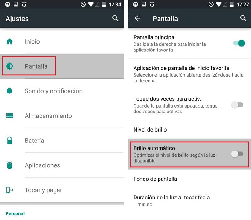 Une fois à l’intérieur, nous irons à la section qui dit «appareil» et nous choisirons l’option «écran», déjà sélectionné une fenêtre s’ouvrira où nous verrons les fonctions correspondant à l’écran, là nous ne désactiverons que l’option qui dit «luminosité automatique» et plus tard, nous redémarrerons l’appareil.