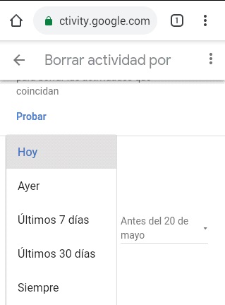 - La première option que nous verrons sera celle de la date et, comme dans la précédente, un menu apparaîtra pour sélectionner si ce sont les informations de «Aujourd’hui» ou toutes les informations de «Toujours» que nous voulons supprimer.