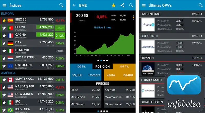 C’est une autre des applications que les experts du domaine conseillent le plus d’utiliser, car elle garantit des résultats magnifiques aux investisseurs sur le long terme . Depuis Infobolsa, il est possible de voir comment la valeur de chaque action varie, en temps réel . En outre, il dispose d’une section actualités qui vous tient au courant de ce qui se passe instantanément, en particulier sur les changements de la prime de risque et des taux d’intérêt .