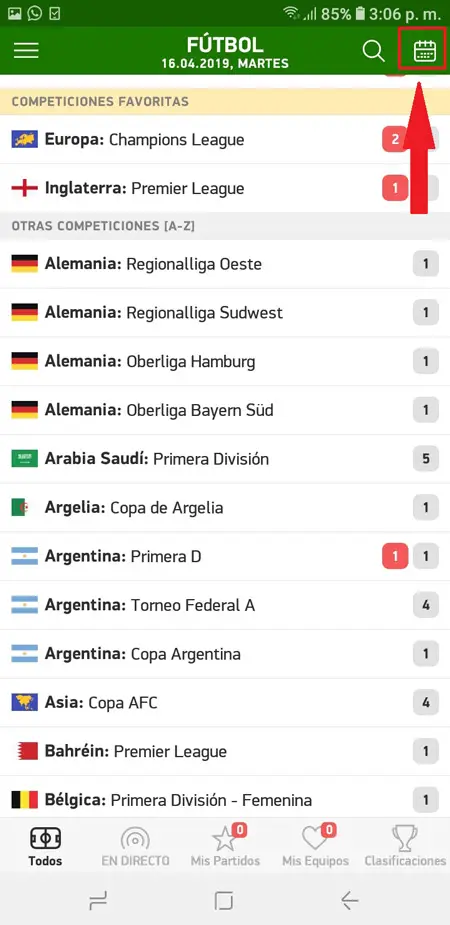 Il s’agit de faire en sorte que le programme ne vous envoie que des notifications de cette section. Pour pouvoir ajouter les matchs des équipes que vous souhaitez dans cette section, il vous suffit de le marquer d’une étoile et ils seront automatiquement ajoutés à «Mes matchs».