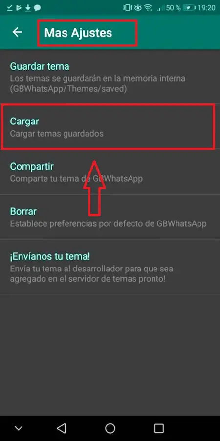 - Lors du téléchargement du thème, nous retournons à l’option «Charger» et sélectionnons les images que nous avons recherchées, il sera automatiquement chargé et nous pourrons commencer à profiter d’un fond sombre dans l’application de messagerie instantanée