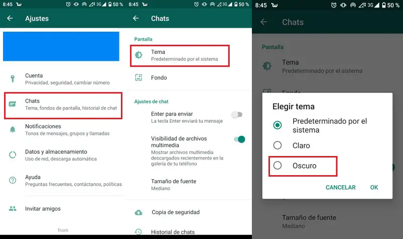- Dans cette section, vous en trouverez un autre appelé «Thèmes», il vous suffit de sélectionner le «Sombre» et de cliquer sur «OK» et le tour est joué, vous aurez le thème sombre de WhatsApp activé.