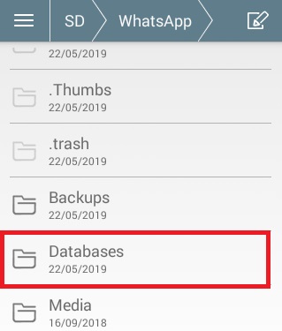 - Après cela, vous devez entrer la carte SD et à la fin des dossiers, vous trouverez «WhatsApp», ici vous devez cliquer sur le dossier qui dit «Bases de données».