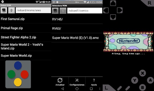 Il prend en charge les formats de fichiers SMC, FIG, SFC, 7z et ZIP. En particulier, cela vous montrera une liste des ROM disponibles que vous avez déjà sur votre appareil, si vous ne les avez pas, il vous suffira de les rechercher et de les télécharger, puis de pouvoir les utiliser. Permet l’utilisation de commandes ou de boutons sans fil sur le panneau tactile sur l’écran de l’ordinateur.