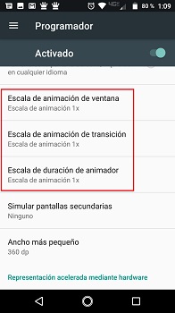 - Vous choisirez les options suivantes pour désactiver : «Echelle d’animation de la fenêtre», «Echelle d’animation de transition», «Echelle de durée de l’animateur».