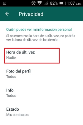 Une autre façon de passer inaperçu est de cacher notre dernière connexion. Peut-être qu’avec cela, nous ne cacherons pas complètement notre connexion, car ils peuvent nous voir «en ligne» pendant que nous écrivons, mais si nous ajoutons cela aux méthodes précédentes, nous serons sûrement un peu plus cachés: