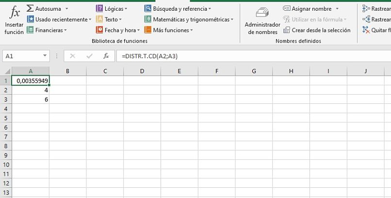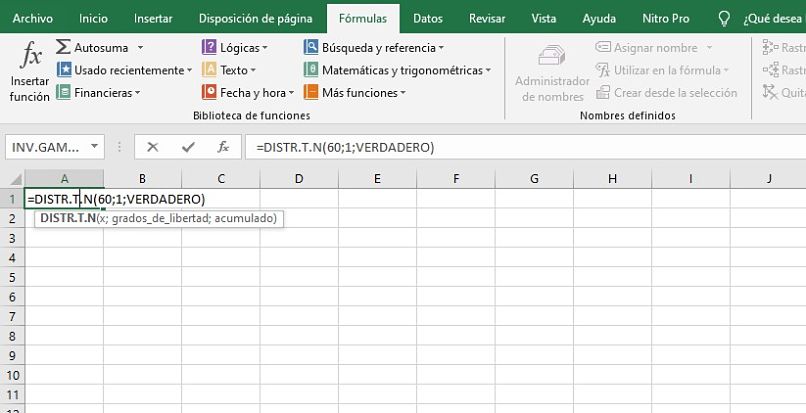 Son expression dans la barre de formule est = TNDIST , suivi de la valeur numérique, des degrés de liberté et du cumul. Ce sont des arguments obligatoires qui doivent être entre parenthèses à côté de la fonction pour l’application et le calcul.
