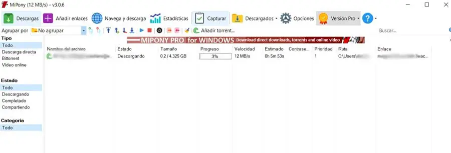 Au fur et à mesure que nous ajoutons des liens vers la section des téléchargements de ce programme, il peut être intéressant pour nous de jeter un œil à leur statut. Ici, quelque chose d’aussi important que la connexion que nous avons à ce moment-là, ou la bande passante utilisée par MiPony, entrera en jeu.
