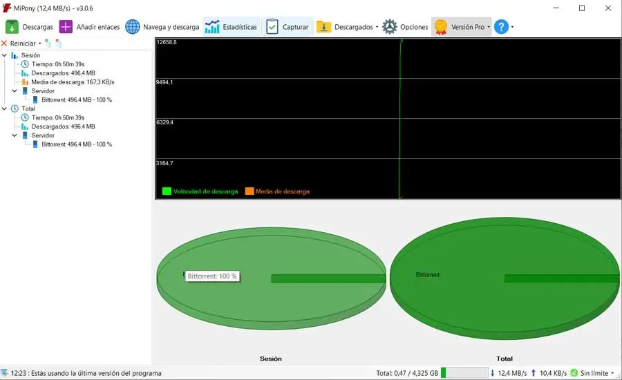 Avec tout et avec cela et en cliquant simplement sur le bouton Statistiques de l’interface principale, nous verrons que des graphiques apparaissent à l’écran qui nous montrent la vitesse des téléchargements en temps réel, ainsi que leur moyenne, combien nous avons téléchargé, ou ce qui reste, entre autres données. Tout cela sera très utile, surtout si nous devons contrôler un bon nombre de téléchargements actifs en même temps.