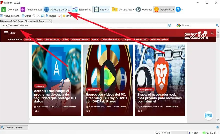 À ce stade, nous vous dirons que dans ce cas, nous ne trouvons pas seulement un programme pour une gestion efficace des téléchargements, mais que MiPony va encore plus loin. Avec cela, ce que nous voulons vous dire, c’est que l’application dispose de son propre navigateur Web. Ainsi, les choses seront beaucoup plus rapides et plus faciles, car à partir de là, nous pouvons accéder directement aux plateformes de téléchargement et aux sites Web.