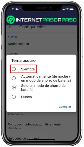 - Et enfin dans «Thème sombre «, nous choisissons «Toujours» , bien que vous puissiez choisir le mode sombre uniquement la nuit ou également uniquement avec économie de batterie, cela est à la discrétion de l’utilisateur.