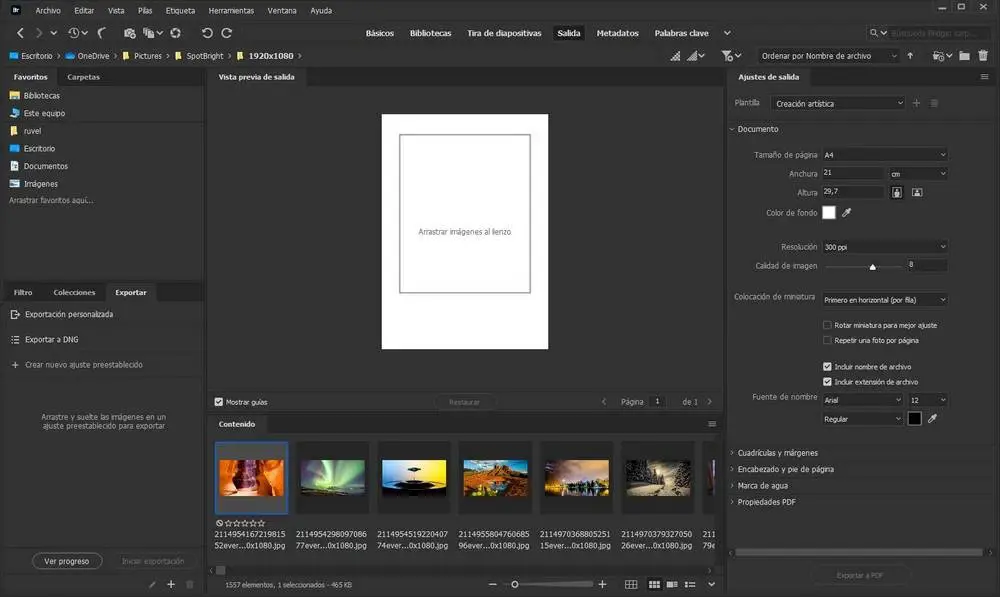 Bridge a plusieurs sections qui, selon celle que nous choisissons, nous montreront l’une ou l’autre des informations, et nous pouvons voir les photos d’une manière ou d’une autre. Par exemple, nous pourrons voir les photos comme dans une pellicule, ou organisées par bibliothèques. Aussi, si nous envisageons d’exporter les photos et que nous voulons façonner le projet, nous pouvons avoir une toile vierge dans la section «Sortie» pour les composer comme nous le souhaitons.