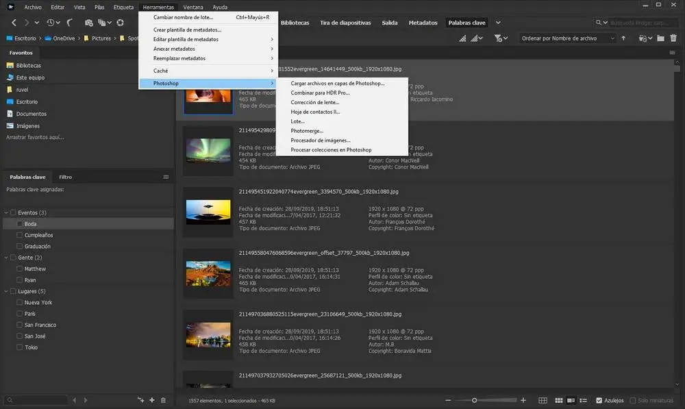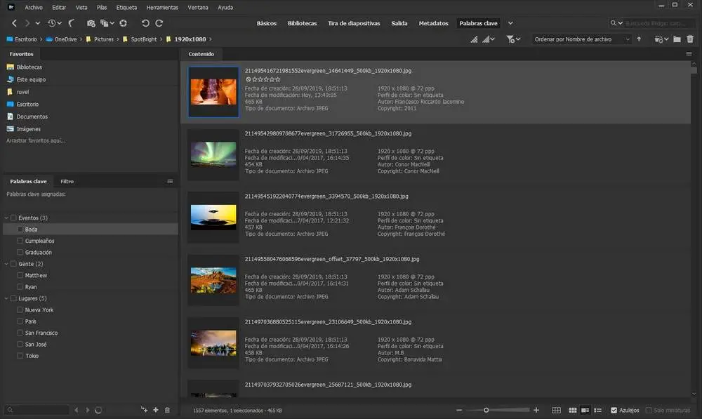 De là, nous pourrons explorer tous les répertoires de l’ordinateur à la recherche des photos que nous avons enregistrées sur le PC. Dès que nous sélectionnons un dossier avec des photos, ou des projets d’autres programmes Adobe, nous pourrons voir une liste avec les vignettes de toutes les photos. Et si nous en sélectionnons un, nous pouvons en voir toutes les propriétés.