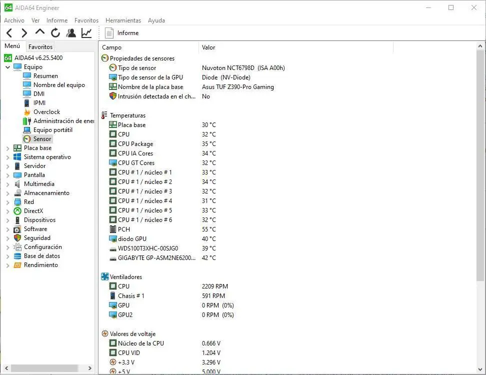 Au-delà des informations que nous montre ce logiciel, une autre des utilisations les plus fréquentes de ce logiciel est de pouvoir contrôler la température et la tension de tous les composants. Dans Équipement> Capteur, nous pourrons voir les valeurs de température de tous les composants (processeur, graphiques, disques durs, etc.) afin de savoir s’ils fonctionnent à leurs valeurs optimales ou s’ils peuvent avoir des problèmes de température (qui, souvent, entraînent des plantages, des redémarrages et d’autres échecs).