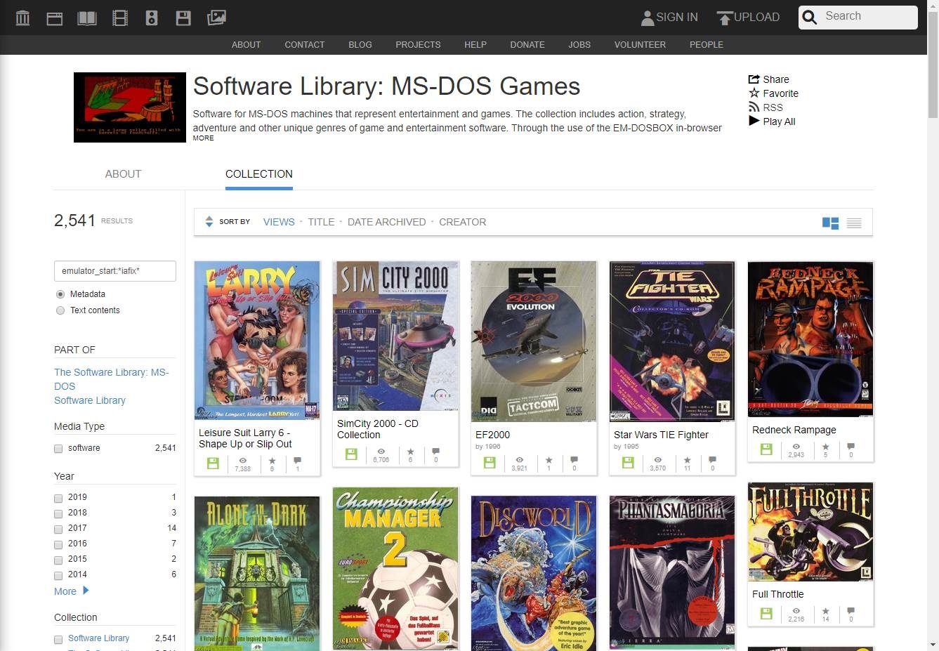 Cette collection se compose de 2541 jeux classiques sortis pour MS-DOS (nombre qui augmente de jour en jour) et nous pouvons voir tous ces jeux dans une liste. De plus, on peut trier cette liste de différentes manières, par exemple par nom ou par créateur, par titre ou par visites, pour connaître les jeux plus ou moins populaires de l’ère DOS.