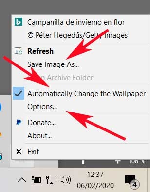 Cela signifie que le programme lui-même continue de fonctionner en arrière-plan.De plus, avec peu de ressources informatiques, nous ne remarquerons pas qu’il est là. De cette manière, pour configurer le logiciel en tant que tel et ainsi pouvoir l’adapter à nos besoins, il suffit de cliquer sur cette icône avec le bouton secondaire de la souris . Ensuite, une liste apparaît avec les options directes que nous pouvons personnaliser. Nous trouverons ici la possibilité de sauvegarder l’image que l’on voit en arrière-plan à ce moment, sur le disque dur. Cela nous permettra de stocker ces photos attrayantes localement au cas où nous voudrions les utiliser plus tard par nous-mêmes. De plus, tous sont distribués légalement et sont gratuits, ils ne nous feront donc jamais de mal.